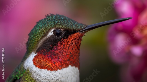 © Sanju, Naklejka premium Close up of a ruby throated hummingbird with vibrant colors against a blurred floral background