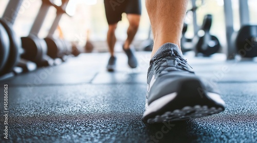Fototapeta premium Close-up of a runner's foot in a modern athletic shoe, stepping onto a textured gym floor. The background is blurred, showing a person and gym equipment. : Generative AI