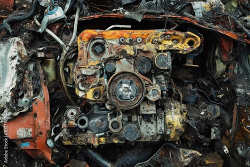 © momostudio, Fototapeta premium Close-up of a Rusted and Damaged Car Engine in a Junkyard