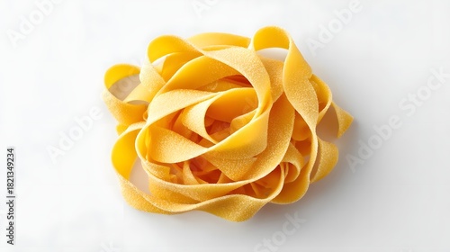 © pkproject, Fototapeta premium Close up of a rustic uncooked nest of fresh golden yellow ribbon pasta such as fettuccine or tagliatelle with a textured surface on a plain white backdrop
