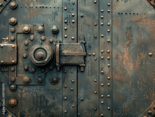 Fototapeta premium Close up of a rusty metal door with rivets and a large lock.