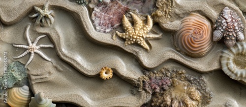 Obraz premium Close up of a sandy beach with seashells and starfish.