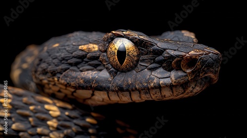 Fototapeta premium Close-up of a scaly viper snake with striking golden eyes in dark setting