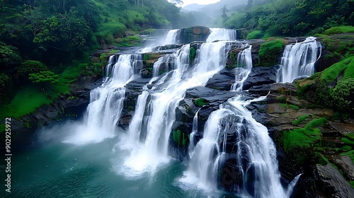 © naphat, Obraz premium Close-up of a scenic waterfall with mist creating a mystical atmosphere, more clarity with clear light and sharp focus, high detailed