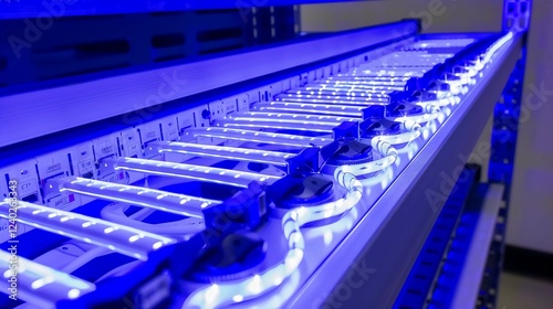 Fototapeta premium Close-up of a secure telecom server room with glowing blue lights, showcasing advanced cybersecurity technology and data protection infrastructure.