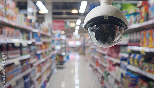 Fototapeta premium Close-up of a security camera in a retail store, highlighting surveillance...
