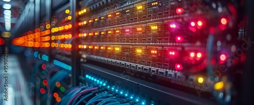© DYAH, Fototapeta premium Close up of a server rack with glowing lights.