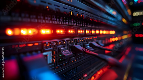 © Siasart Stock, Fototapeta premium Close-up of a server rack with illuminated indicators and connected cables.