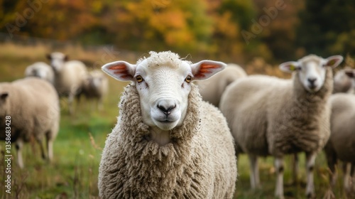 © Crafted, Fototapeta premium Close up of a sheep in a field looking at the camera