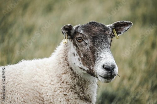 © Wirestock, Naklejka premium Close-up of a sheep with ear tags in a grassy field.