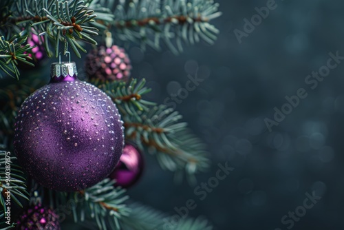 Obraz premium Close-up of a shimmering purple ornament hanging on a green pine branch,...
