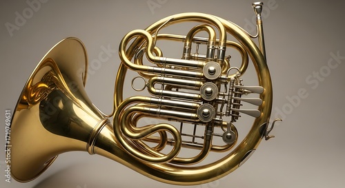 Fototapeta premium Close-up of a shiny brass French horn, a classical musical instrument, against a neutral background.