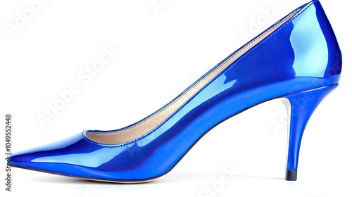 © Suphawan, Obraz premium Close-up of a shiny pair of blue high heels on a white background, showcasing fashion-forward style and bright color.