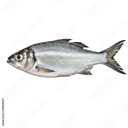 © dark knight, Obraz premium Close-up of a shiny silver fish with large eyes and a forked tail on a white background.