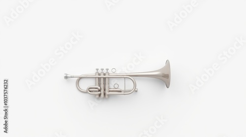 Obraz premium Close-up of a shiny silver trumpet displayed on a clean white surface,...