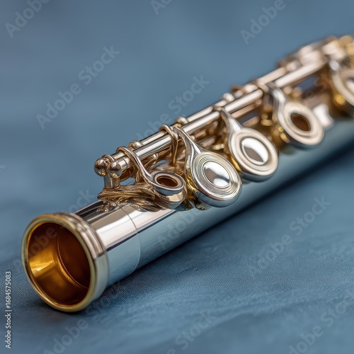 Naklejka premium Close up of a silver flute resting on a blue fabric background. The flute's details and craftsmanship are highlighted.