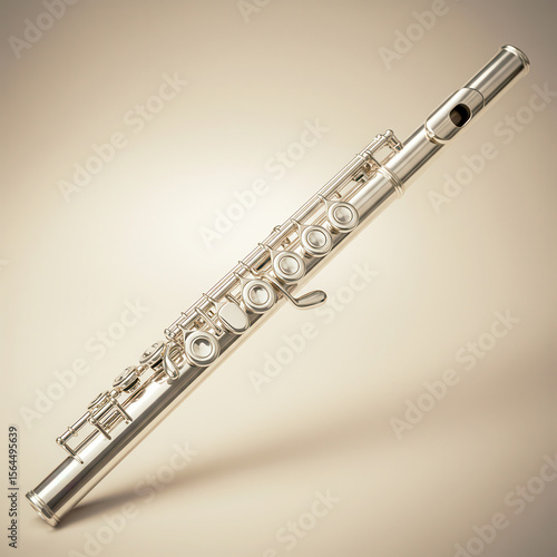 © ศาศวัต ธีรเศรษฐบดี, Fototapeta premium Close-up of a silver metal concert flute with detailed keys, isolated on a warm beige gradient background, ideal for music themes.