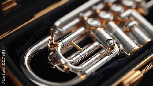 © ROY, Naklejka premium Close-up of a silver trumpet in its case.