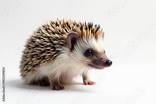 © Sasira, Fototapeta premium Close-up of a single hedgehog against a stark white backdrop, detail, pet
