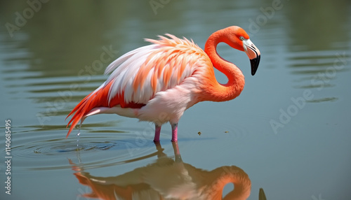© Gavasol, Fototapeta premium Close-up of a single pink flamingo standing in shallow water with ripples around it