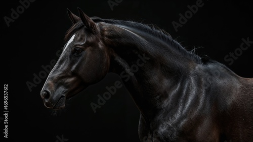 © TheWaterMeloonProjec, Fototapeta premium Close-up of a sleek black horse standing alone against a dark background.
