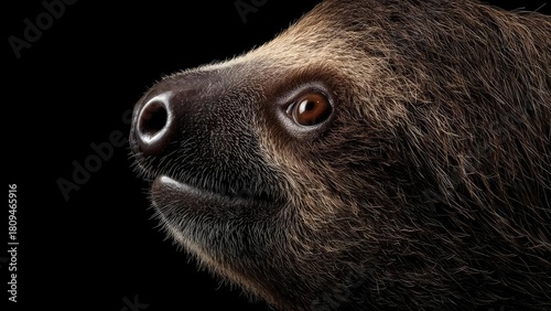 © Anastasiia, Naklejka premium Close-up of a sloth's face against a black background. Concept Sloth close-up, Black background, Intimate wildlife portrait, Soft lighting, Textured fur