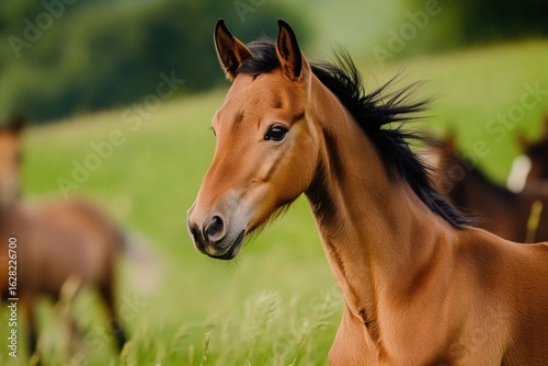 © Chayanan, Fototapeta premium Close-up of a small brown Arabian foal with another animal in the horse closeup detail