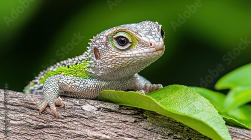 © V_Design_Creator, Fototapeta premium Close up of a small, colorful lizard perched on a tree branch amidst vibrant green foliage. The lizard's scales shimmer, exhibiting a mix of green