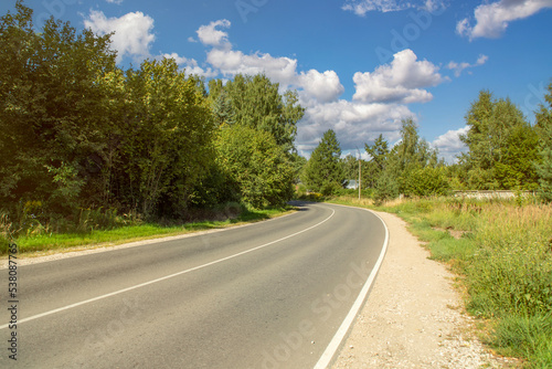 © Николай Батаев, Fototapeta premium Close-up of a small empty highway in the countryside. Road turning between trees. Suburban asphalt two-lane road.