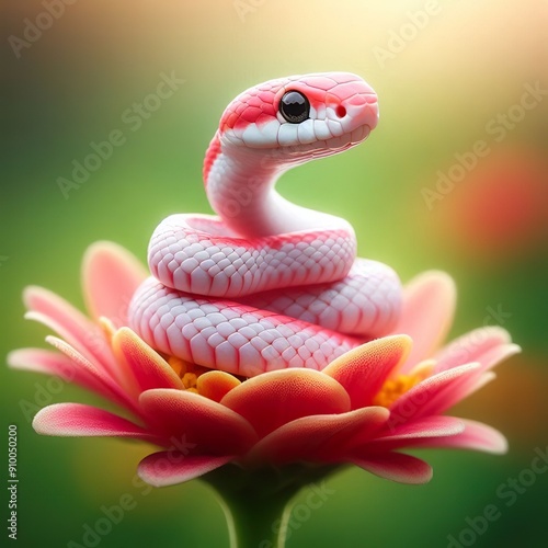 © JetHuynh, Fototapeta premium Close-up of a small light red snake with a white belly and pink nose, standing on a beautiful flower