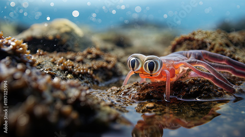 © Yura, Fototapeta premium Close-up of a Small Red Sea Creature on a Rocky Reef