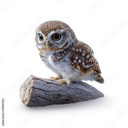 © khonkangrua, Naklejka premium Close-up of a small spotted owl perched on a piece of wood, showcasing its detailed feathers and alert expression against a white background.
