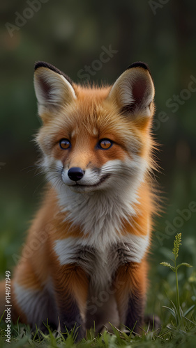 Fototapeta premium Close-up of a smiling baby fox, vibrant orange fur with white chest,...