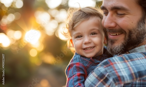 © panumas, Obraz premium Close-up of a smiling child being held by an adult outdoors during sunset.
