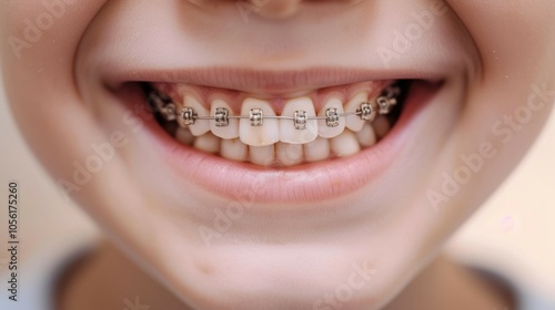 © Leo, Fototapeta premium Close-up of a smiling child with braces showcasing dental care and orthodontic health