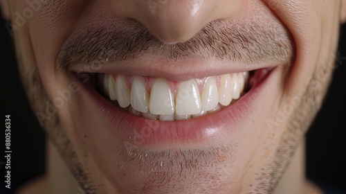 © Alex, Obraz premium Close-up of a smiling man's mouth with clean white teeth and a beard. Dental care and hygiene photography for design and print. Health and wellness concept.