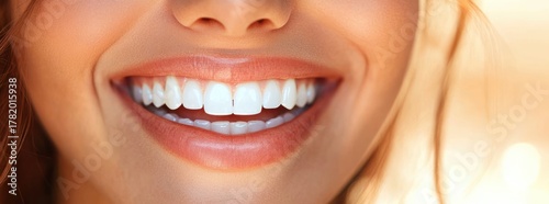 Obraz premium Close-up of a smiling person showing white healthy teeth and natural lips with soft warm lighting background
