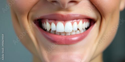 Fototapeta premium Close-up of a smiling woman's mouth with open lips and visible white healthy...