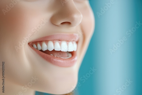 © Sweettymojidesign, Fototapeta premium Close-up of a smiling woman showcasing healthy, white teeth against a blue background.