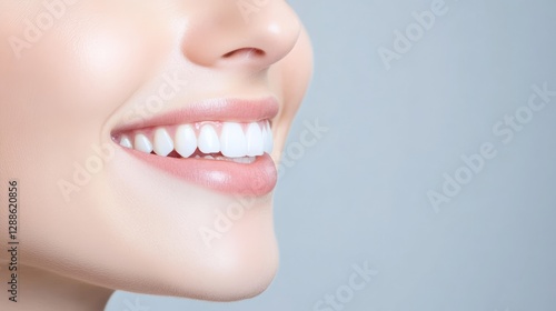 © olga_demina, Obraz premium Close up of a smiling woman showcasing her healthy teeth and lips, emphasizing beauty and wellness, perfect for concepts related to dental hygiene and cosmetic care