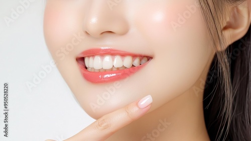 © K-MookPan, Fototapeta premium Close-up of a smiling woman showcasing her perfect teeth and radiant skin, highlighting beauty and confidence.