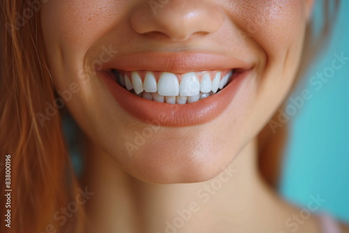 Fototapeta premium Close-up of a smiling woman with bright white teeth and light brown hair,...