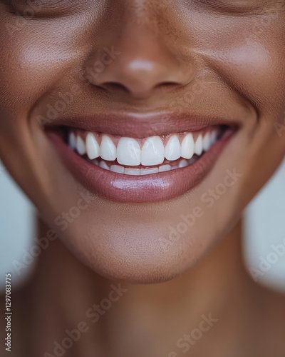 Obraz premium Close-up of a smiling woman with perfect teeth, representing confidence and health. Ideal for dental care, beauty, wellness, and personal care brands.