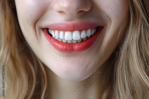 © Valentin, Fototapeta premium Close-Up of a Smiling Woman with Red Lipstick and White Teeth