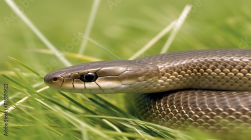 © AnggunArtworks, Obraz premium Close-up of a snake coiled in green grass.