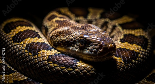 Obraz premium Close-up of a snake's intricate skin patterns in a dark setting, showcasing...