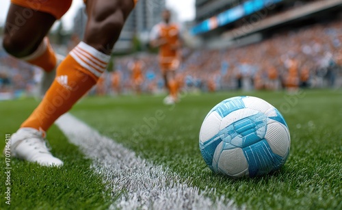 © Kien, Fototapeta premium close-up of a soccer ball on a corner flag, with one player in an orange uniform about to kick it towards the goal during a match at a stadium