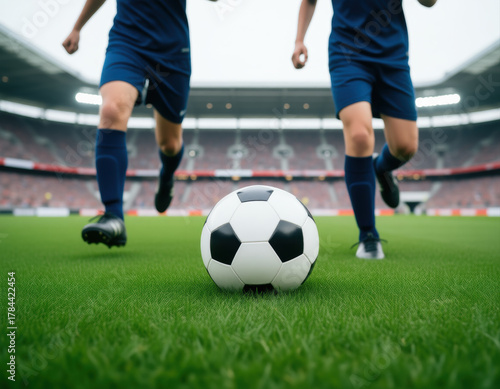 © Facundo, Fototapeta premium Close-up of a soccer ball on the grass with two players running towards it during a match in a professional stadium.