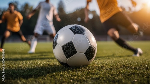Fototapeta premium Close-up of a soccer ball resting on the grass with players legs in action...