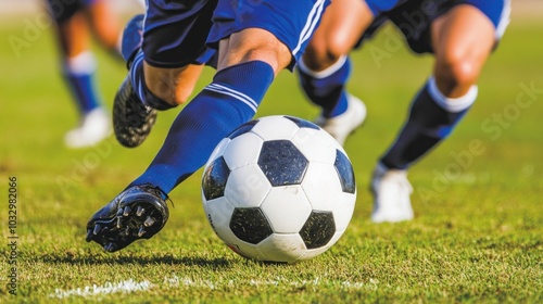 Fototapeta premium Close up of a soccer player kicking the ball during a game.